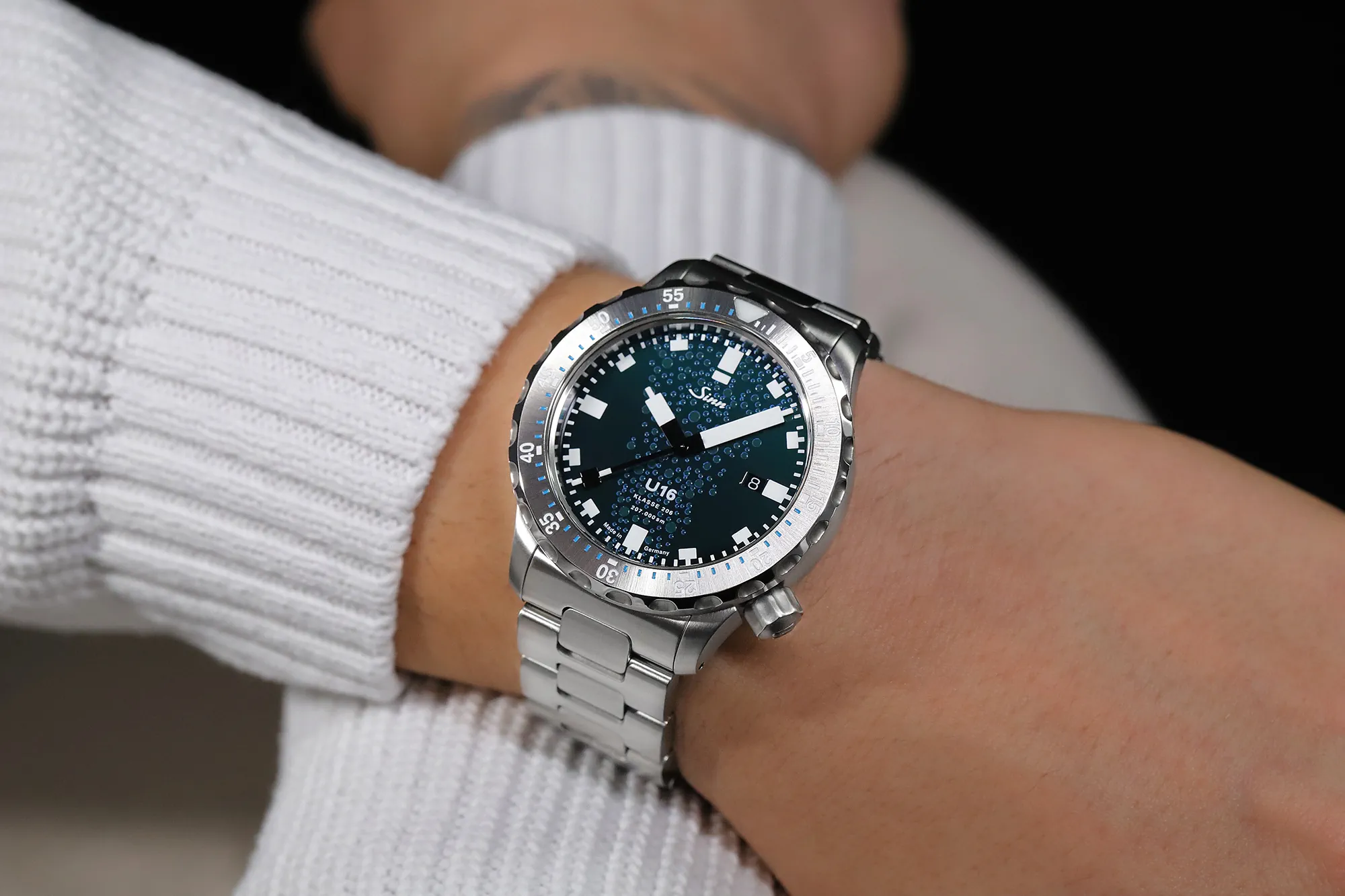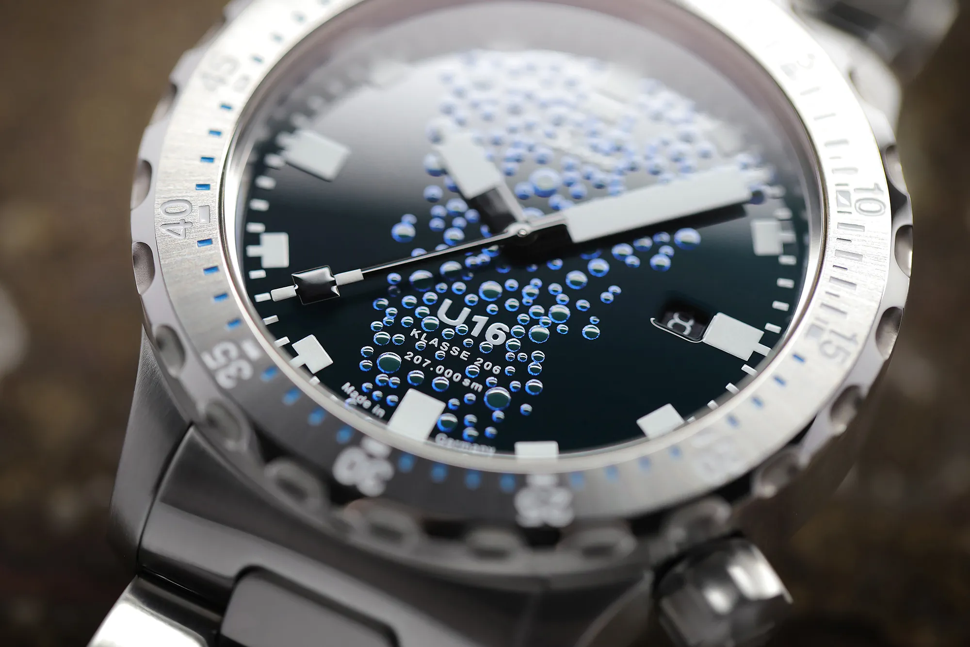 Szkło szafirowe z powłoką antyrefleksyjną w U16 gwarantuje nadzwyczajną przejrzystość i zapewnia optymalny widok na tarczę o wysokim połysku, na której rozbrzmiewają hipnotyzujące niebieskie niuanse oceanu. Ciemny, niebieskawozielony bazowy ton przedstawia ezoteryczny bezmiar otwartego morza na głębokości około 30 metrów, nawiązując do operacyjnego zasięgu okrętu podwodnego U 16, który był w stanie zanurzyć się aż do 100 metrów. Stylizowane bąbelki powietrza symbolizujące unoszące się pod wodą powietrze wraz z metalicznym niebieskim i zieleniami podkreślają efekt trójwymiarowości. Ta sprzeczność przynosi unikalny akcent na tarczy i przyciąga wzrok intrygującym efektem stereoskopowym. Jako historyczny dowód potęgi łodzi podwodnych, na tarczy umieszczono liczbę przebytych mil morskich i klasyfikacyjny typ łodzi U 16. Dekiel został udekorowany dopasowanym zarysem okrętu podwodnego typu 206. U16 został przetestowany zgodnie z europejskimi standardami dla sprzętu nurkowego i jest certyfikowany przez niezależny instytut, zapewniający, że zegarek jest wytrzymały i niezawodny.