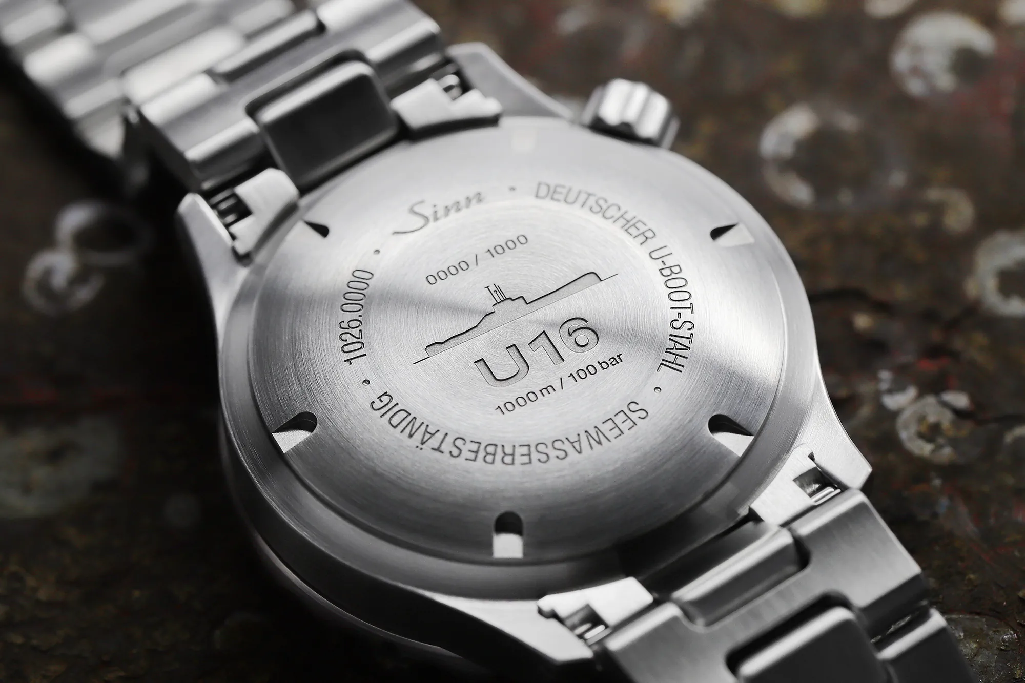 Stal w modelu U16 wyróżnia się jednym kluczowym aspektem: ten bazowy materiał był wcześniej przez dziesiątki lat w użytku na morzu i to czyli go tak specjalnym! Profesjonalne, skrupulatne i złożone wykończenie przez zegarmistrzowską, technologiczną firmę Sächsische Uhrentechnologie GmbH Glashütte (SUG) z siedzibą w Saksonii gwarantuje, że stal spełnia nasze rygorystyczne wymagania bez utraty swojej prawdziwej tożsamości. Rezultat? Zegarek nurkowy wykuty w oparciu o historię, przenoszący duszę marynistycznej historii na nadgarstek. Zwieńczeniem tego doświadczenia jest grawerowana stalowa kostka z oryginalnej łodzi podwodnej U 16, dołączona do zegarka.
