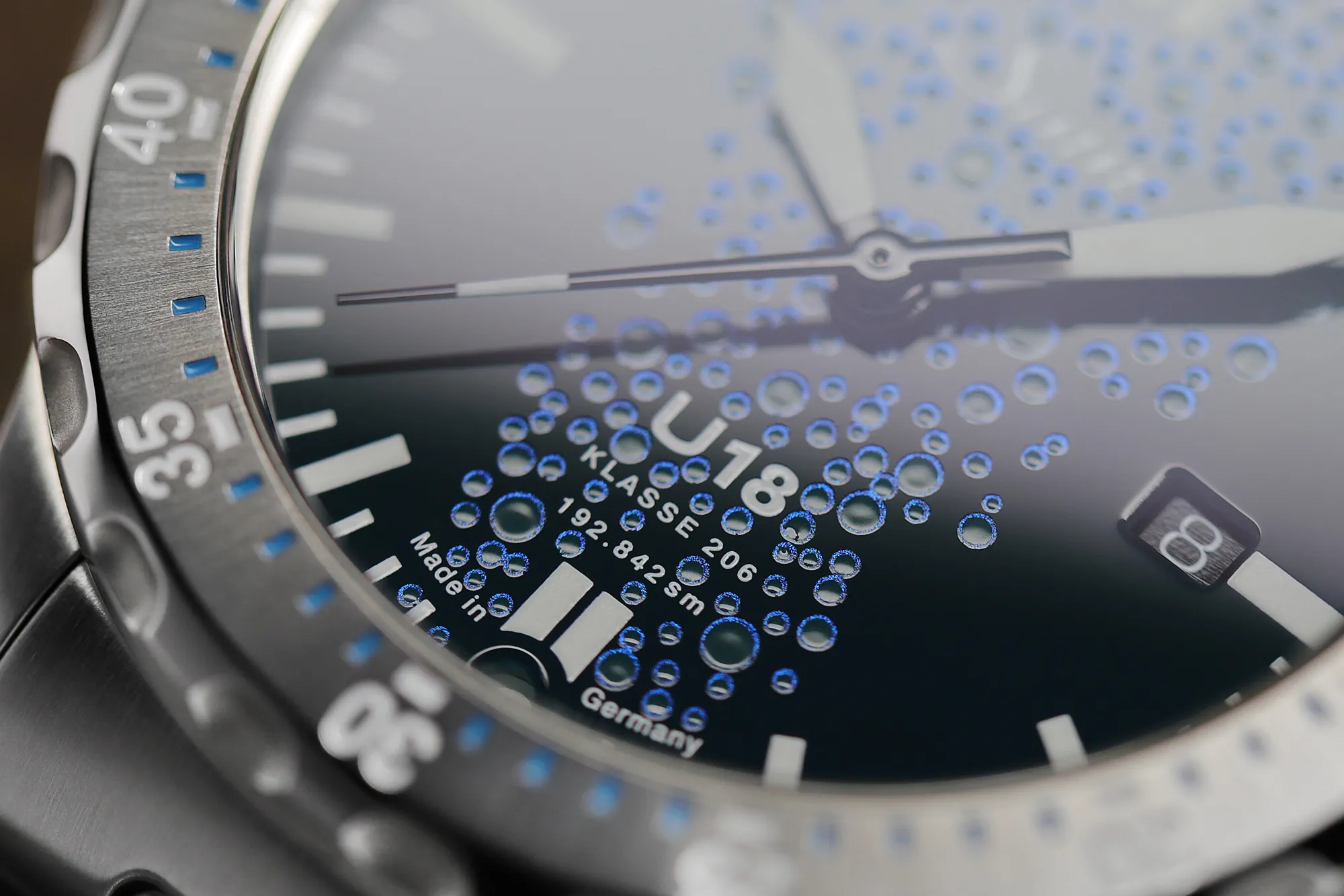 Szkło szafirowe z powłoką antyrefleksyjną w U18 gwarantuje nadzwyczajną przejrzystość i zapewnia optymalny widok na tarczę o wysokim połysku, na której rozbrzmiewają hipnotyzujące niebieskie niuanse oceanu. Ciemny, niebieskawozielony bazowy ton przedstawia ezoteryczny bezmiar otwartego morza na głębokości około 30 metrów, nawiązując do operacyjnego zasięgu okrętu podwodnego U 18, który był w stanie zanurzyć się aż do 100 metrów. Stylizowane bąbelki powietrza symbolizujące unoszące się pod wodą powietrze wraz z metalicznym niebieskim i zieleniami podkreślają efekt trójwymiarowości. Ta sprzeczność przynosi unikalny akcent na tarczy i przyciąga wzrok intrygującym efektem stereoskopowym. Jako historyczny dowód potęgi łodzi podwodnych, na tarczy umieszczono liczbę przebytych mil morskich i klasyfikacyjny typ łodzi U 18. Dekiel został udekorowany dopasowanym zarysem okrętu podwodnego typu 206. U18 został przetestowany zgodnie z europejskimi standardami dla sprzętu nurkowego i jest certyfikowany przez niezależny instytut, zapewniający, że zegarek jest wytrzymały i niezawodny.