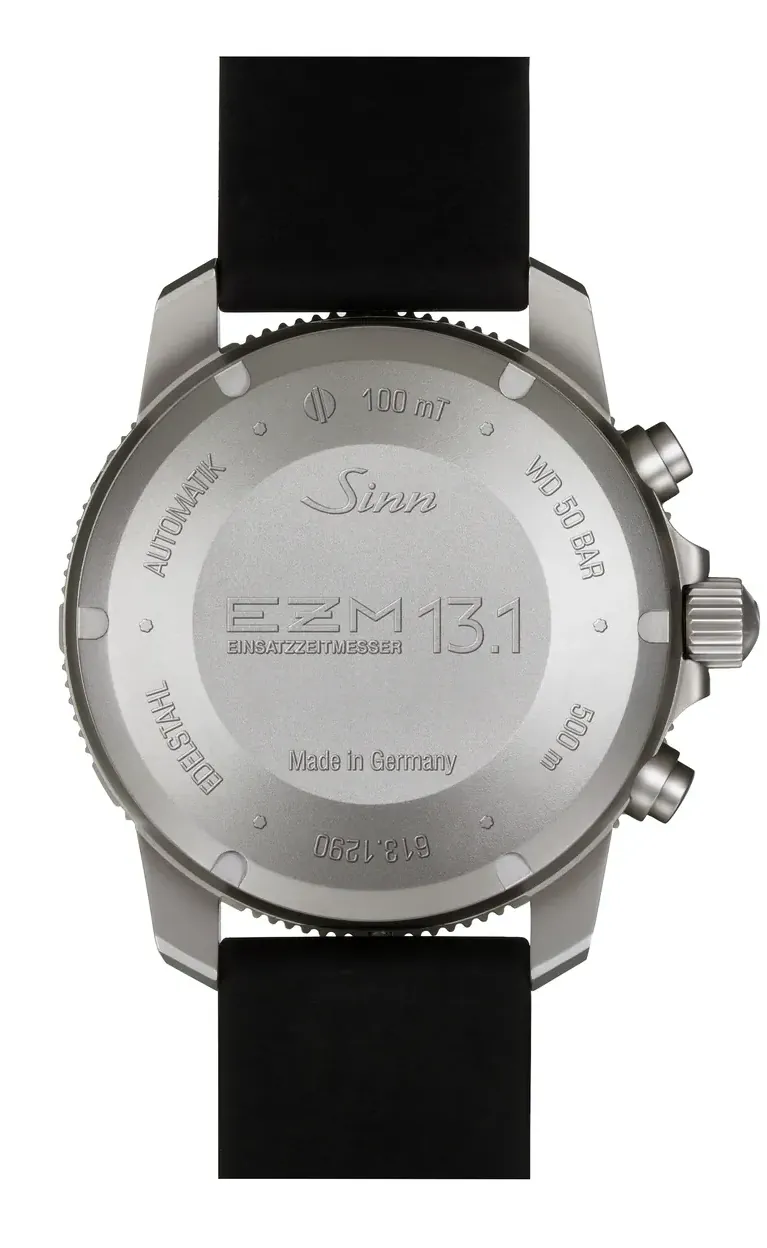 Zegarki dla nurków Sinn EZM 13.1 | 613.011 z przodu ochrania szkiełko ze szkła szafirowego, a z tyłu lekko profilowany, solidny dekiel ze stali nierdzewnej z danymi technicznymi i napisem Made in Germany. Szkiełko divera Sinn EZM 13.1 | 613.011 podobnie jak w innych modelach marki ma obustronną powłokę antyrefleksyjną, a dekiel jest zakręcany oraz nie zawiera niklu, dlatego jest bezpieczny dla alergików.