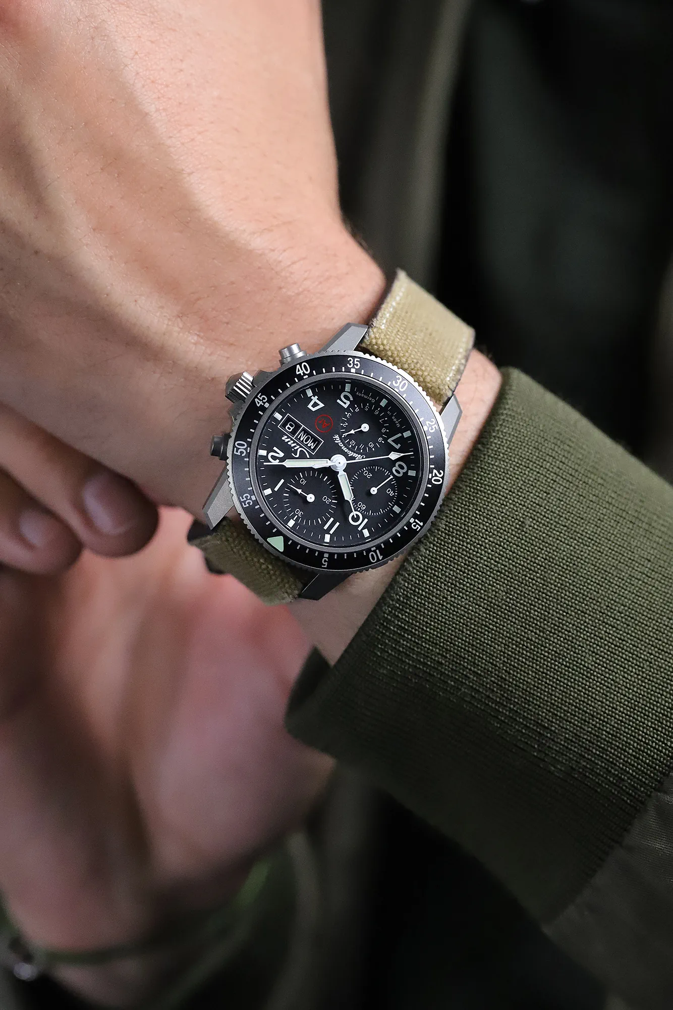 Powierzchnia czarnej, matowej tarczy zegarka lotniczego Sinn 103 Ti Ar | 103.071 jest wykorzystana w pełni, by zagwarantować noszącemu szereg funkcjonalności. Szkieletowe wskazówki pokryte masą świecącą, podobnie jak indeksy godzinowe, pozwalają na standardowy odczyt czasu w każdych warunkach oświetlenia. W świetle dnia możemy korzystać z funkcji chronografu, którego subtarcze na godzinie dwunastej i szóstej odmierzają kolejno upływające minuty i godziny. Umieszczone z boku tarczy zegarka lotniczego Sinn 103 Ti Ar | 103.071 okienko datownika pozwala ustawić bieżącą datę i dzień tygodnia wyświetlany w języku niemieckim lub opcjonalnie angielskim (zobacz też inne Zegarki lotnicze).