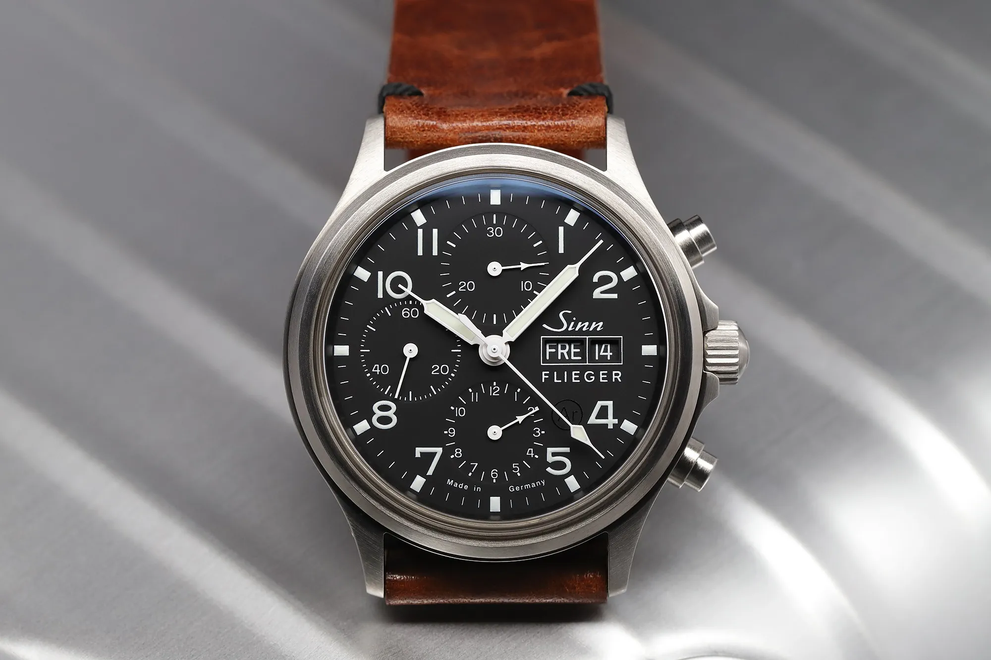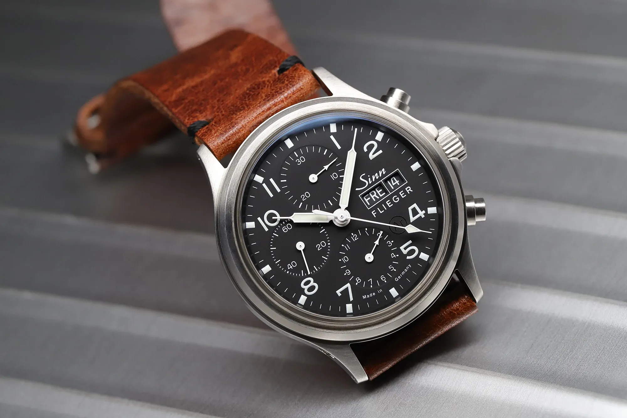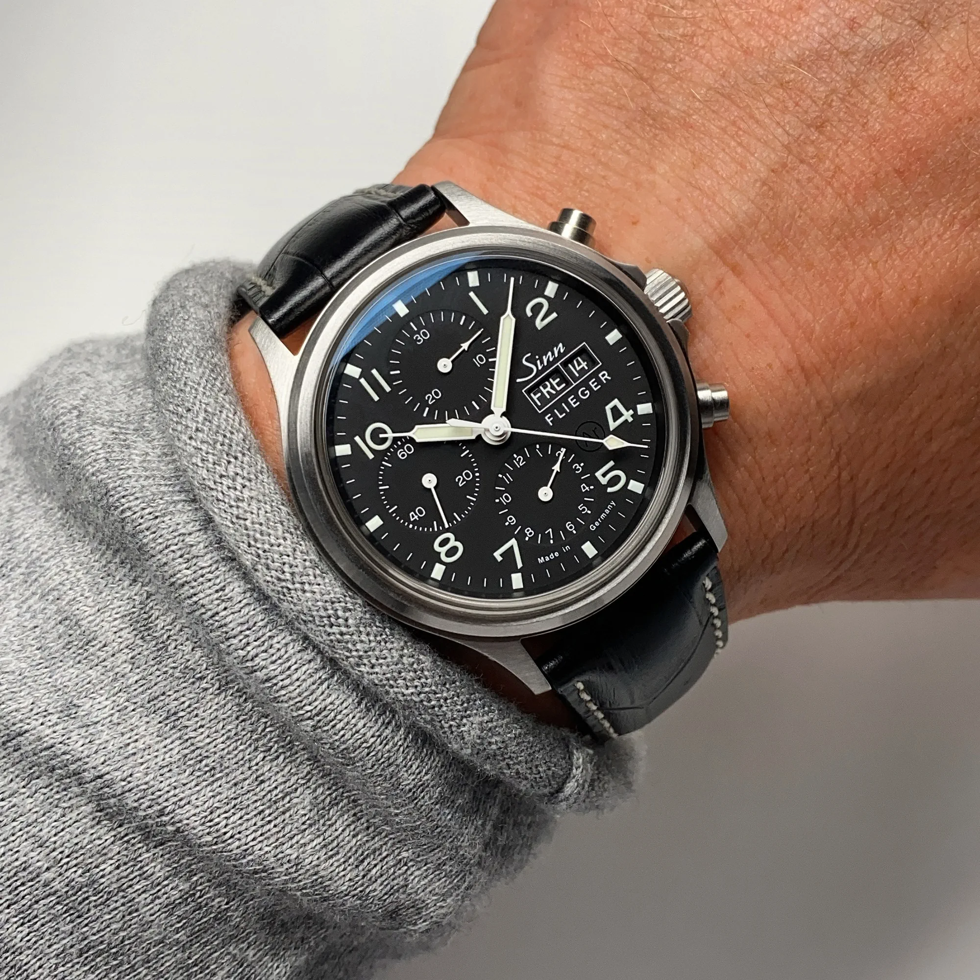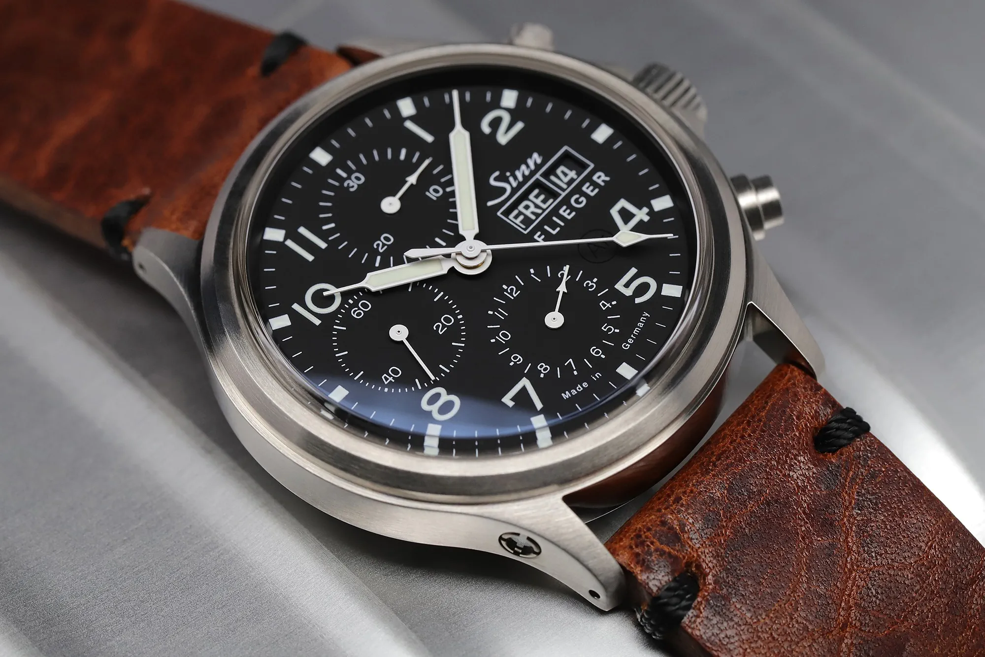 Zegarek lotniczy Sinn 358 Sa PILOT | 358.060 jest większym bratem bliźniakiem słynnego chronografu Sinn 356. Oprócz większej średnicy koperty i sklepionego szkiełka to ciągle ta sama czarna, matowa tarcza, na której "wiele się dzieje". Po trzech wewnętrznych tarczach poruszają się wskazówki małej sekundy i chronograficznego licznika minut i godzin. Na godzinie trzeciej zegarka lotniczego Sinn 358 Sa PILOT | 358.060 wpasowano datownik z dniem tygodnia wraz z logo marki i znaczącym napisem FLIEGER (czyli "pilot"). Klasyczne podświetlenie indeksów godzinowych, cyfr arabskich i wskazówek pozwala na szybki odczyt czasu również w słabo oświetlonych pomieszczeniach (zobacz też inne Zegarki lotnicze).