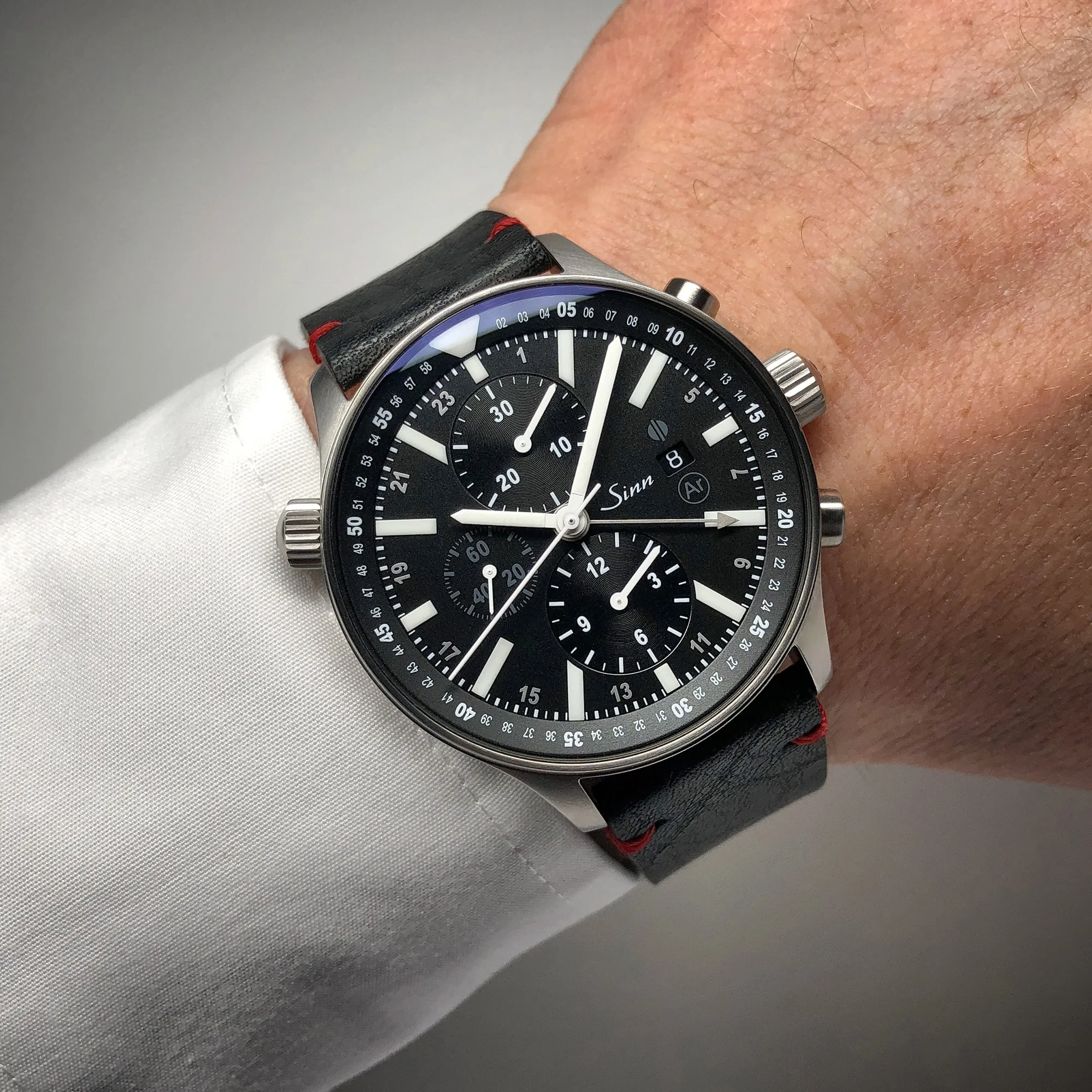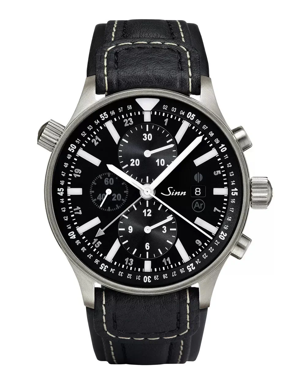 Tarcza zegarka lotniczego Sinn 900 PILOT | 900.011 jest zadziwiającym osiągnięciem w kwestii designu. Tarcza ma ciemny, matowy kolor z wyróżniającymi się, lśniącymi subtarczami. Wyraźne, białe wskazówki i utrzymane w tym samym stylu indeksy zapewniają doskonałą czytelność. Na tle matowej, kruczoczarnej powierzchni tarczy rozlokowano dwie lśniące minitarcze w układzie północ-południe, na których są wyświetlane minuty i godziny chronografu (sekundy stopera odmierza montowany centralnie sekundnik). Oprócz tego na tarczy zegarka lotniczego Sinn 900 PILOT | 900.011 znajduje się jeszcze wyświetlacz małej sekundy i okienko datownika. Całość jest otoczona przez obustronnie obrotowy bezel, który jest obsługiwany za pomocą umieszczonej na godzinie 10 koronki. Wskazówki, indeksy godzinowe i centralny marker bezela świecą w ciemności.