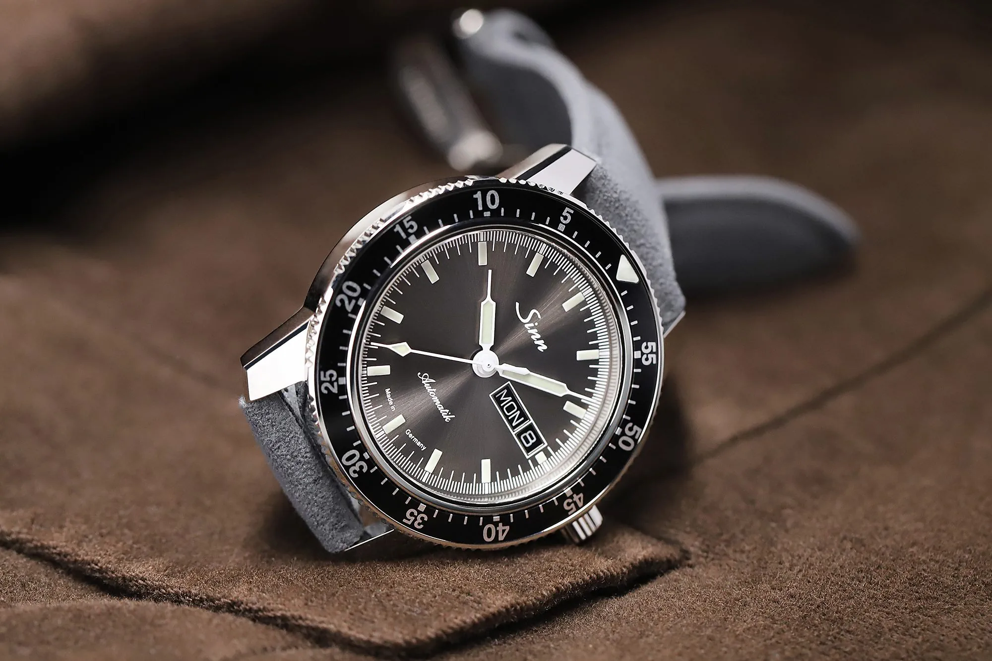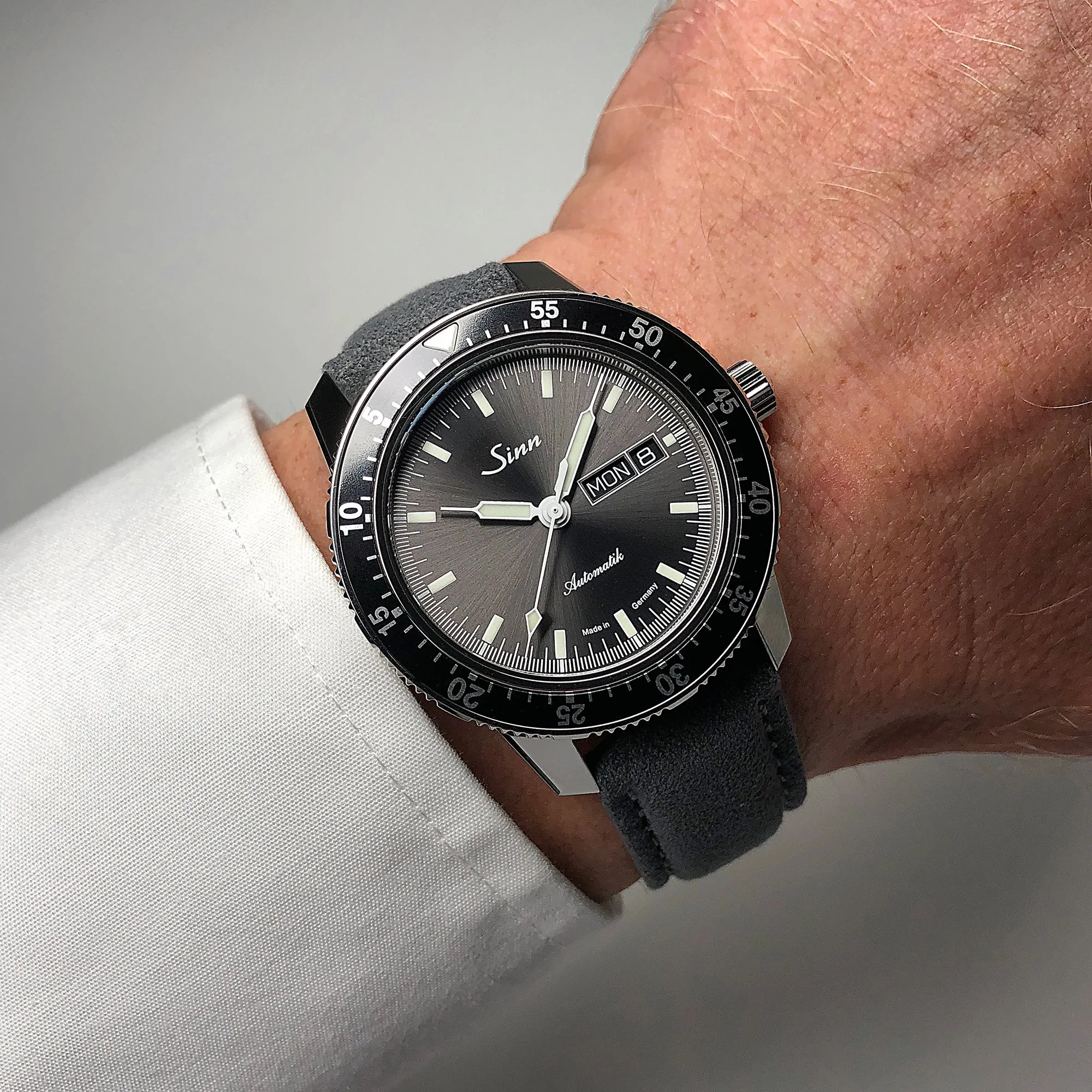 Model 104 St Sa I A ma charakterystyczne malowanie, z wyjątkową tarczą w kolorze antracytowym. Szlif słoneczny podkreśla ponadczasową elegancję zegarka Sinn.
