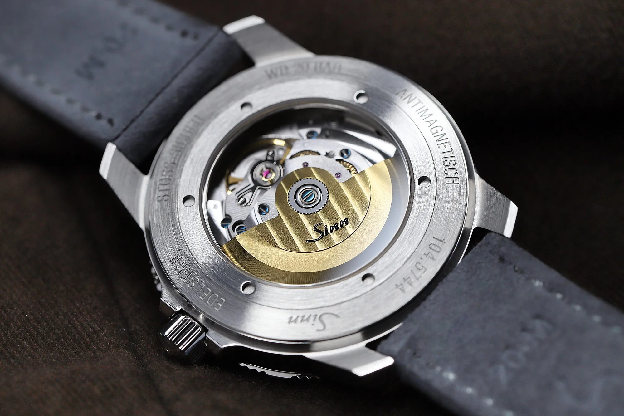 Zegarek pilot Sinn 104 St Sa I A | 104.014 z obu stron jest chroniony przez szkło szafirowe. Na przedni szafir z obu stron nałożono powłokę antyrefleksyjną. Przezroczysty dekiel ma wewnętrzną powłokę antyrefleksyjną i ujawnia delikatne tryby szwajcarskiego mechanizmu.