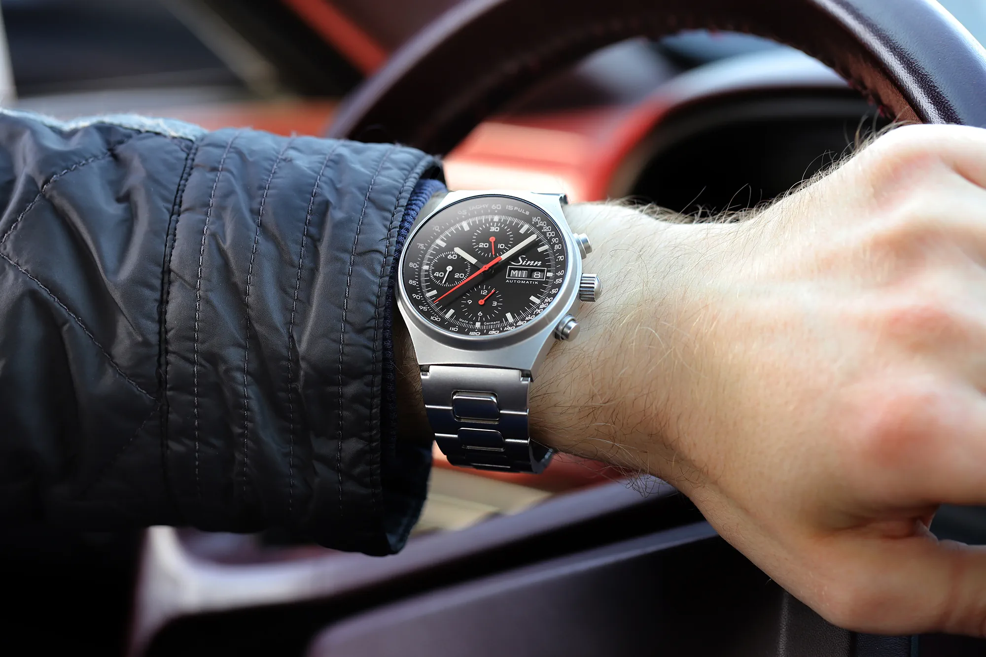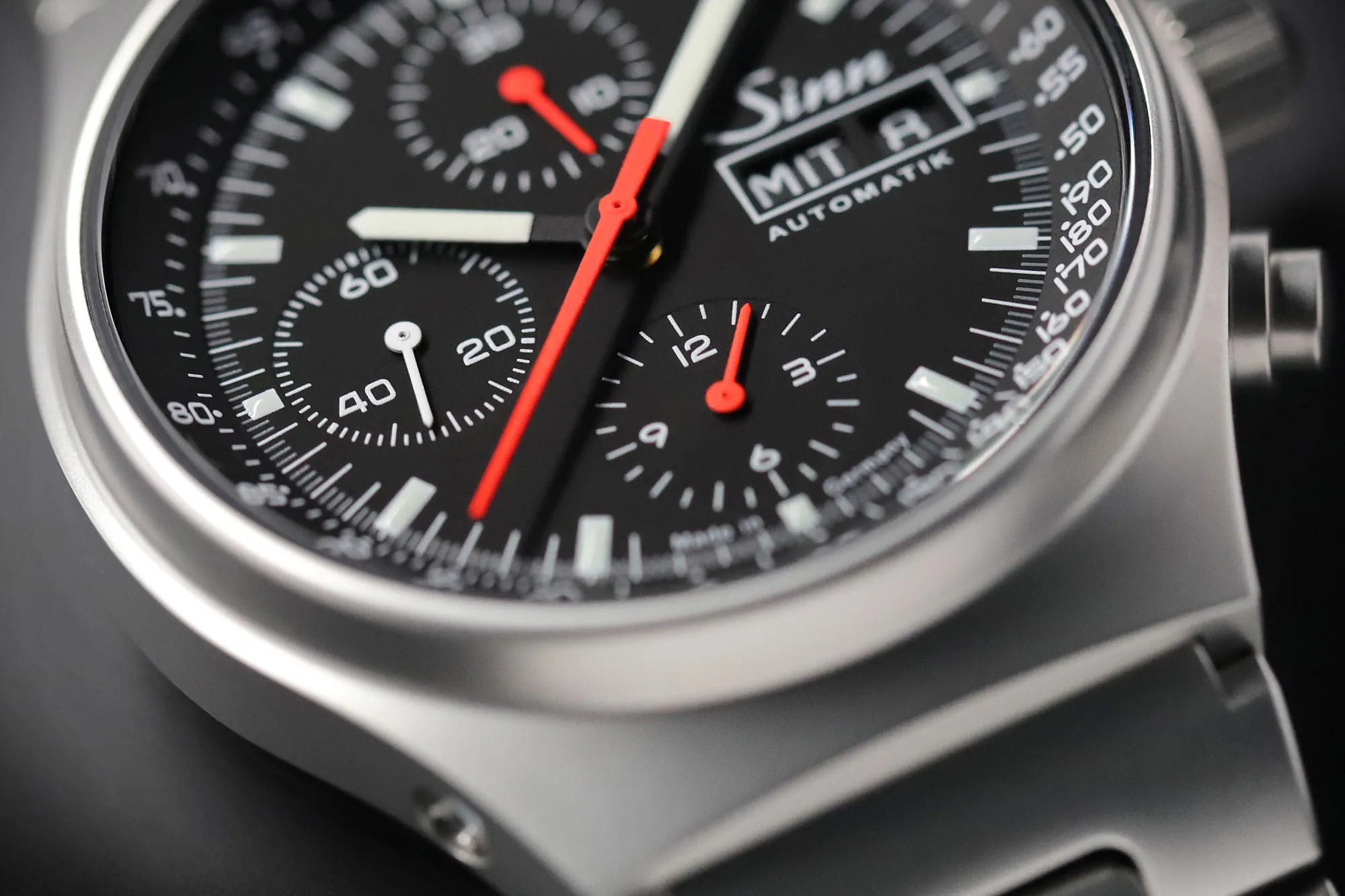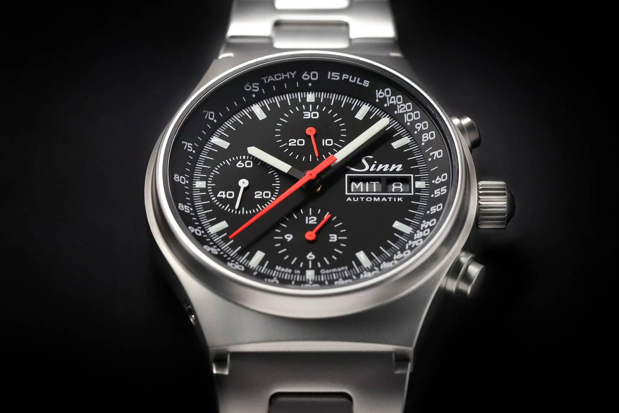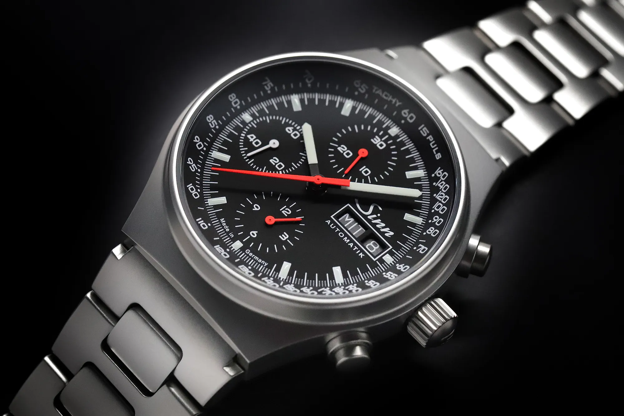 Sinn 144 St Sa ma kompaktową kopertę z nierdzewnej stali ze szkłem szafirowym z przodu i z tyłu. Inne cechy zegarka Sinn to wyświetlacz chronografu z 12-godzinnym licznikiem, przeskakujący 30-minutowy licznik i centralnie umieszczona sekundowa wskazówka stopera. Wszystko to uzupełnia skala tachometru/pulsometru oraz datownik, który pokazuje również dzień tygodnia.