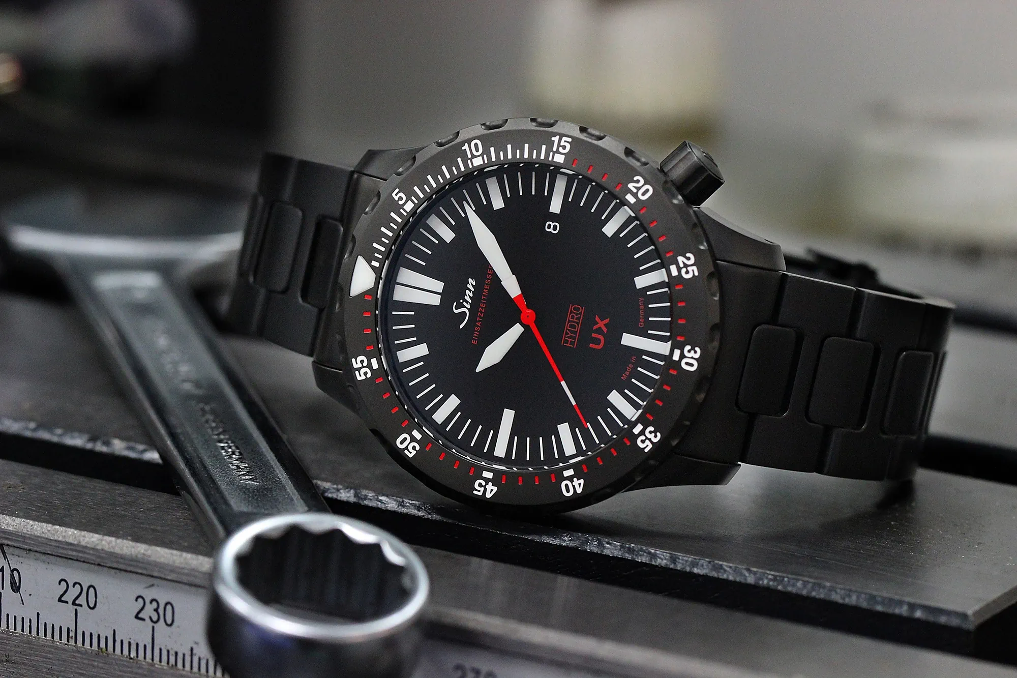 Zegarki divery z serii UX (EZM 2 B) są oficjalnymi zegarkami grupy do działań morskich sił specjalnych GSG 9. Jedną z najbardziej wyróżniających się cech charakterystycznych tej serii, a więc także zegarka Sinn UX S, jest nasza technologia HYDRO. Wypełniamy nasze zegarki specjalnym olejem, który sprawia, że nie odbijają światła pod wodą i są całkowicie wolne od parowania oraz zapewnia, że tarcza może być odczytana pod każdym kątem. A ponieważ jest wypełniona olejem, koperta z odpornej na morską wodę stali submarine może wytrzymać ciśnienie wody na każdej osiągalnej dla człowieka głębokości. Aby zapewnić, że będą jeszcze bardziej solidne, koperty poddaliśmy działaniu technologii TEGIMENT. Oprócz zwiększonej twardości, proces ten umożliwił nam zaaplikowanie wysokiej jakości czarnej powłoki PVD. Połączenie tych dwóch technik sprawia, że zegarek jest perfekcyjnie dopasowany do codziennego użytku. Black Hard Coating na bazie TEGIMENT zapobiega łuszczeniu się, na które generalnie podatne są kolorowe powłoki.